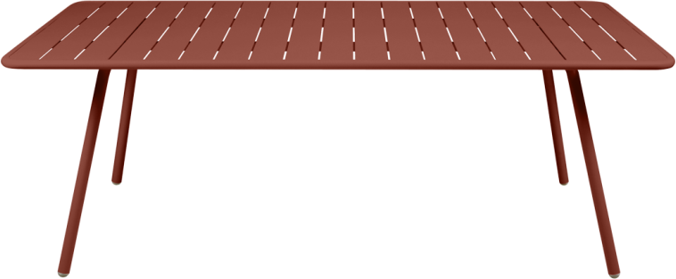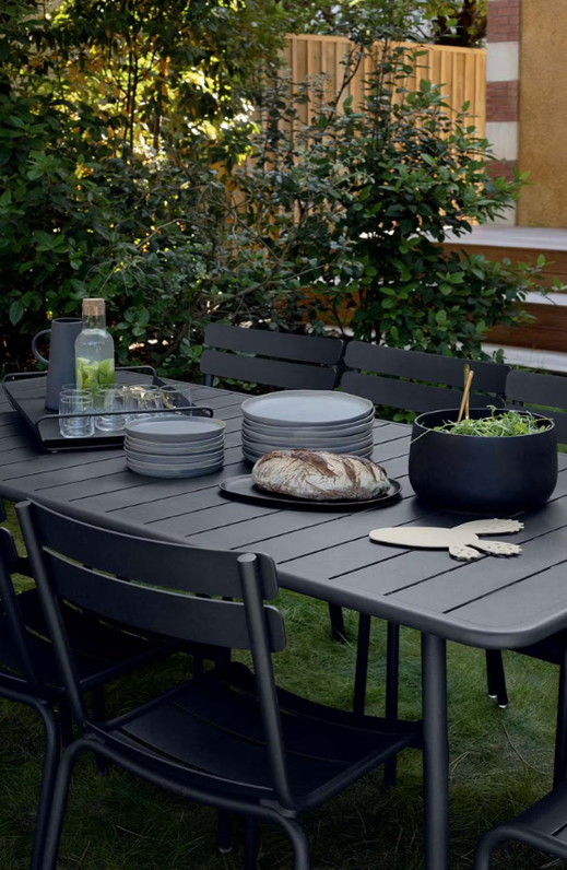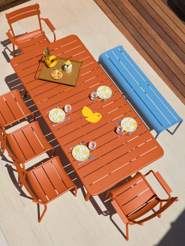 Designed for Fermob by Frederic Sofia the Luxembourg dining table is a contemporary piece with angled tubular legs and a slatted top. The overall look is contemporary yet casual, perfect for outdoor entertaining.